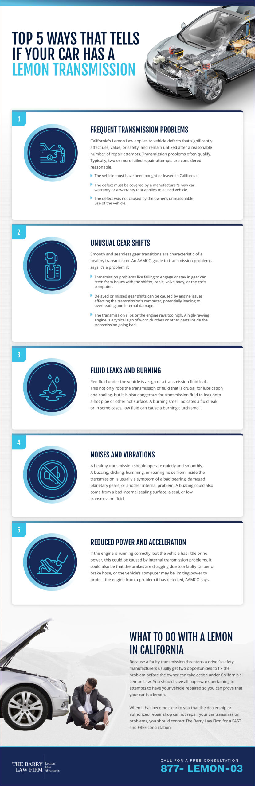 California’s Lemon Law covers cars with transmission issues that start within the warranty period. If you believe you have a Lemon Law claim, contact The Barry Law Firm for a FAST and FREE consultation. We use the state’s Lemon Law to protect consumers. We do not charge clients to handle Lemon Law cases.